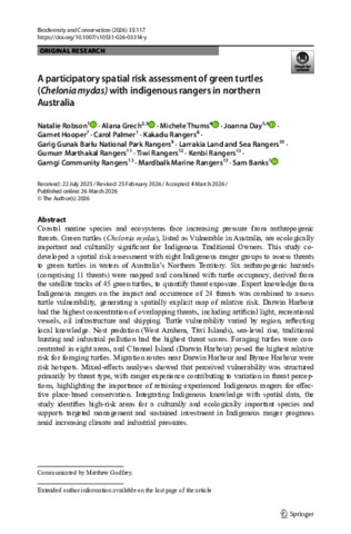 Robson, Natalie, Grech, Alana, Thums, Michele, Day, Joanna, Hooper, Garnet, Palmer, Carol, Kakadu Rangers, Garig Gunak Barlu National Park Rangers, Larrakia Land and Sea Rangers, Gumurr Marthakal Rangers, Tiwi Rangers, Kenbi Rangers, Garngi Community Rangers, Mardbalk Marine Rangers, and Banks, Sam (2026) A participatory spatial risk assessment of green turtles (Chelonia mydas) with indigenous rangers in northern Australia. Biodiversity and Conservation, 35. 117.