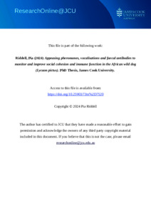 Riddell, Pia (2024) Appeasing pheromones, vocalisations and faecal antibodies to monitor and improve social cohesion and immune function in the African wild dog (Lycaon pictus). PhD thesis, James Cook University.